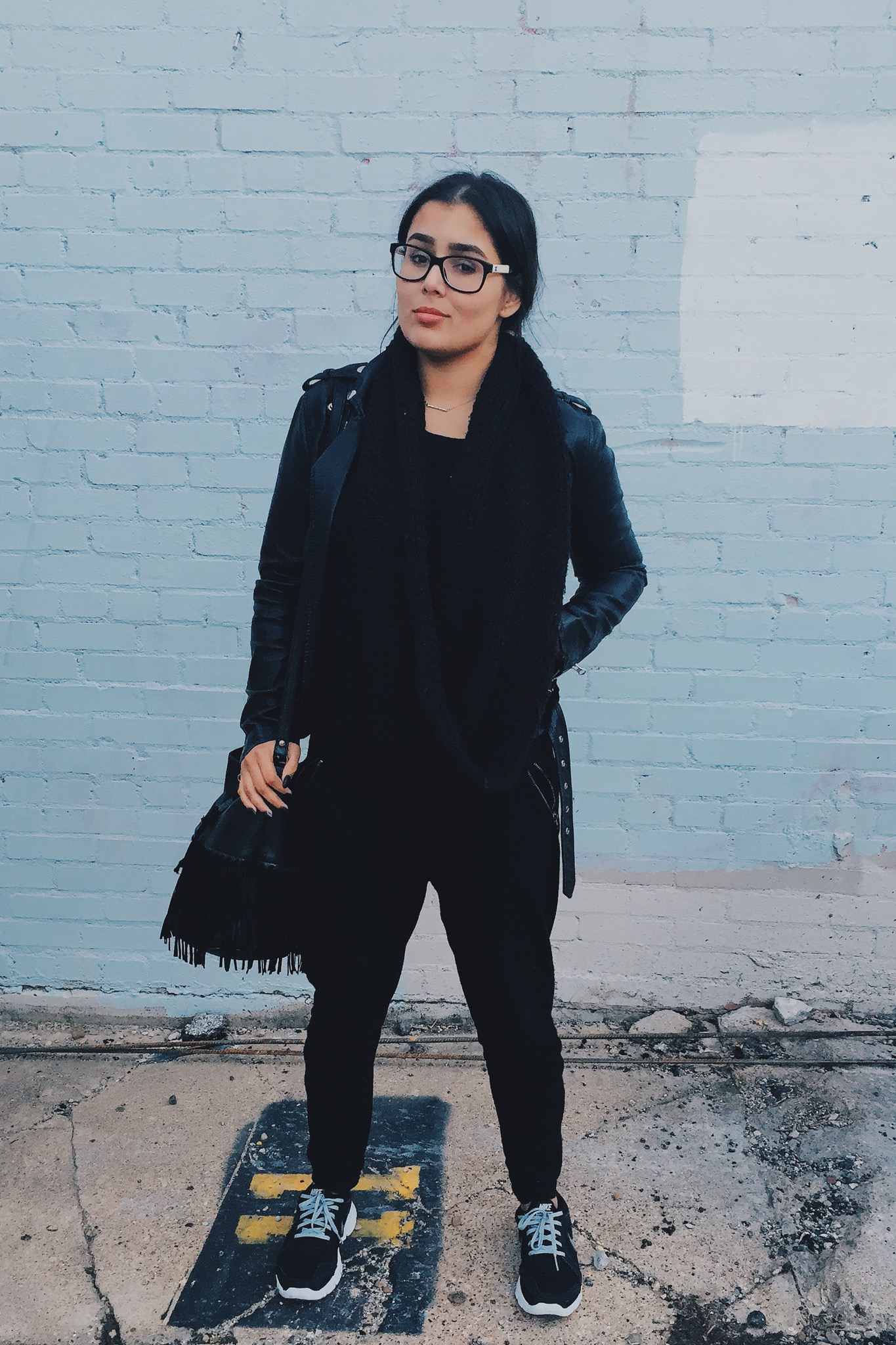 The art of black-on-black-on-black is a process, one that is forever evolving, reminiscing age-old questions such as: Can there ever be such a thing as too much black? The answer is no. For this particular BOBOB ensemble, styled a simple H&M black tee, and H&M drop-crotch sweatpants as my base look. Then I layered my base with my precious, black leather Buffalo x David Bitton jacket, a knit black infinity scarf, and my Nikes. Threw my hair in a low messy bun, and put on my Chanel specs. Edgy and functional.