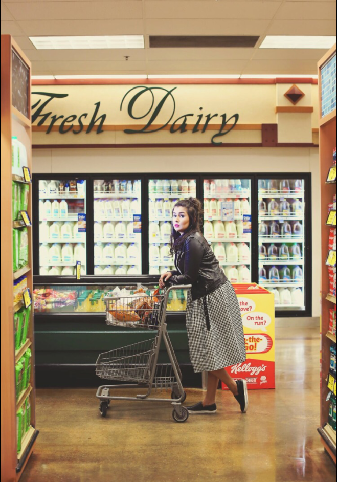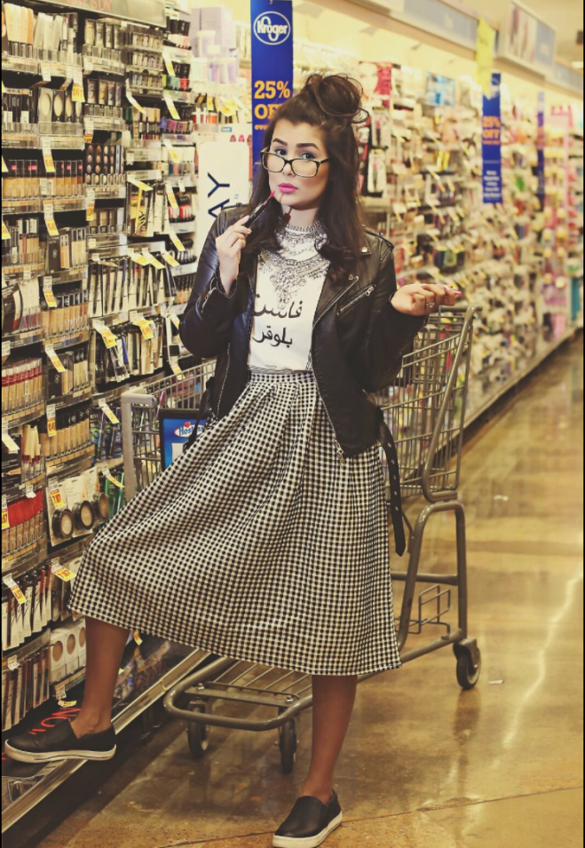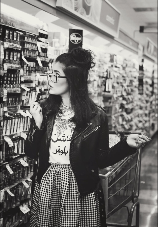 Aisle 14 continues with Edge. Nida Rehman captures me in my staple: a beloved Buffalo by David Bitton leather jacket. I don’t think I could exist without it, really. I paired my staple with a “Fashion Blogger” Arabic tee, a gift from T-Shirt Policy London and Urbanite’s incredible “Aisha” silver statement piece (both brands are featured on Designer[Insider]). The gingham midi skirt from MissGuided ensures I do not look androgynous because sometimes, I dress like a dude. And I love it. The shoes are from Forever 21, topped with a funky little half topknot and last minute specs (courtesy of Nida Rehman herself). Let’s acknowledge how fantastic these shots turned out, despite Nida being blind because I thought her glasses would make me look cooler. Oh, the vanity.