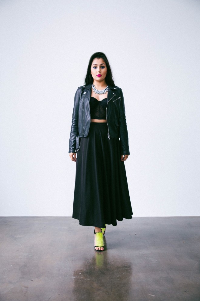 This particular outfit was interesting to style and at times a bit challenging. I mixed edgy masculine leather and a feminine bustier with whimsical fur shoes and a classic midi skirt, paired with a stunning rhinestone necklace from Bali by Sana. This contrast between masculine and feminine has always intrigued me. There is a lot of support for androgynous or gender fluid looks that do not subscribe to one particular stylization. And I think it’s fantastic. Because sticking to convention is so 2001. I initially found myself questioning whether these particular elements would work together, but I think for me lately, it’s not about finding what works, it’s making it work.