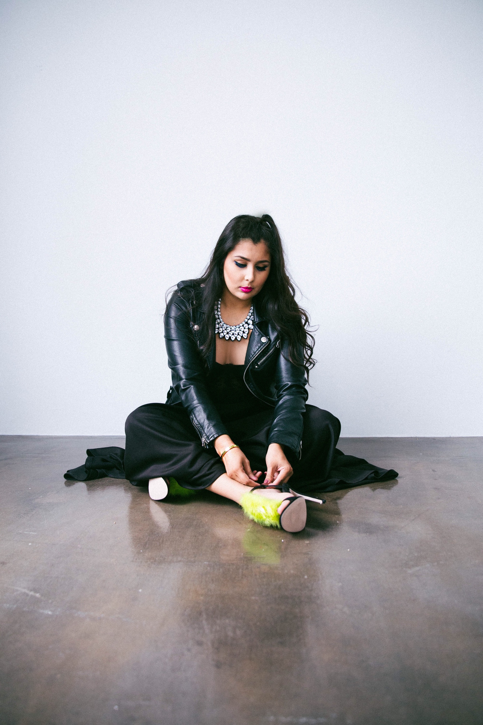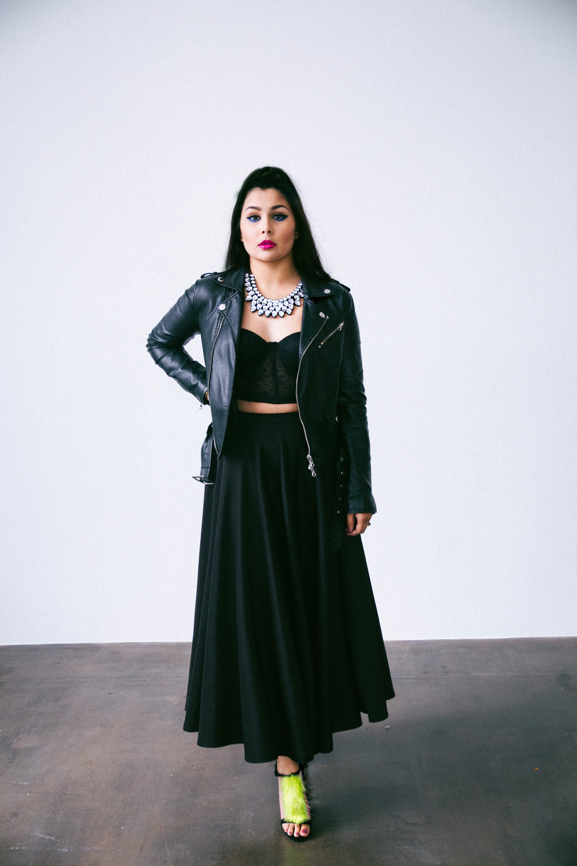 This particular outfit was interesting to style and at times a bit challenging. I mixed edgy masculine leather and a feminine bustier with whimsical fur shoes and a classic midi skirt, paired with a stunning rhinestone necklace from Bali by Sana. This contrast between masculine and feminine has always intrigued me. There is a lot of support for androgynous or gender fluid looks that do not subscribe to one particular stylization. And I think it’s fantastic. Because sticking to convention is so 2001. I initially found myself questioning whether these particular elements would work together, but I think for me lately, it’s not about finding what works, it’s making it work.