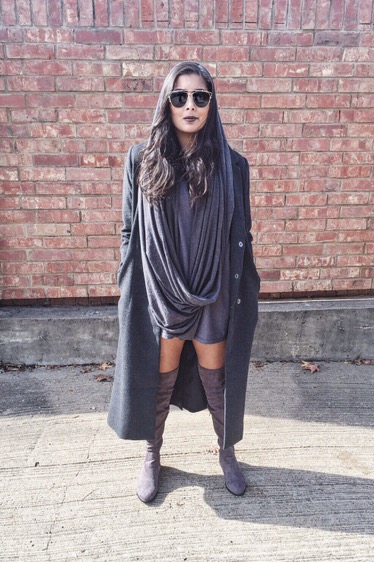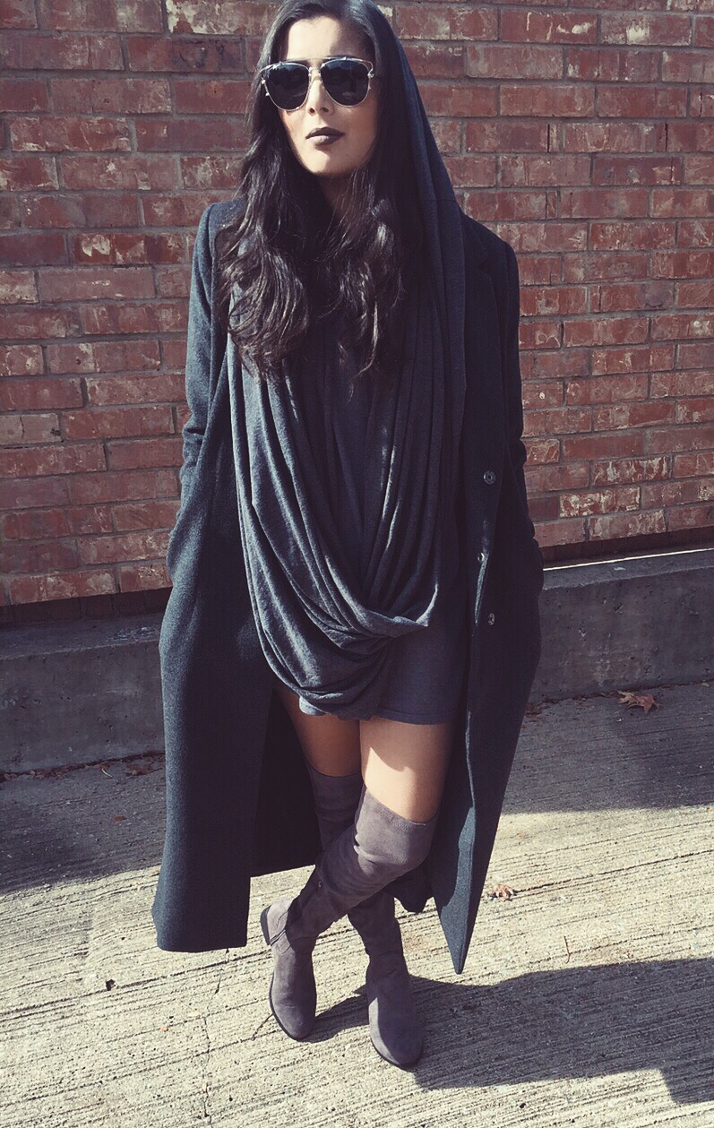 And now to the outfit. We paired a large men’s grey tshirt from Walmart with an oversize wool coat, OTK suede grey boots, and a grey jersey infinity scarf draped over the head all from Forever 21. Complete the outfit with some badass sunnies and you’ve got a complex look for under $100.